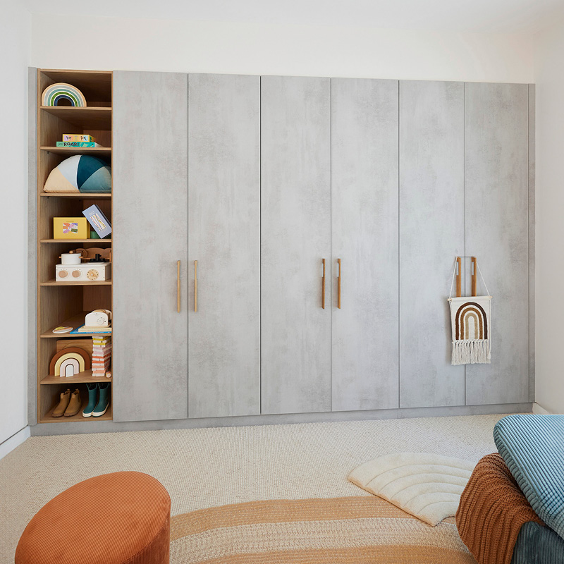 Grey concrete-look Beton Texture wardrobe doors, Oak Bow handles, and Oak Woodgrain internals have been paired together to evoke an earthy style to Kristian and Mimi’s built in wardrobe. A feature section of open shelving has been included in the design to allow for styling décor, while behind closed hinged doors wardrobe storage abounds thanks to blend of drawers, shelves and hanging space.