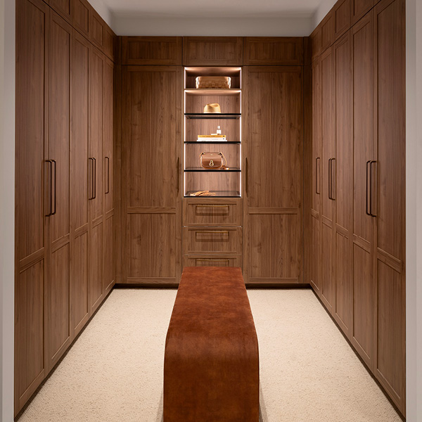 Kristian and Mimi have created a stunning U-shaped walk-in wardrobe featuring Shaker-style Sepia Budino Walnut doors with Champagne Bronze Bar handles. Since the wardrobe is visible from the master bedroom, they chose mainly closed cabinetry, with central Black Frame Glass Shelves to display fragrances, bags, and jewellery.