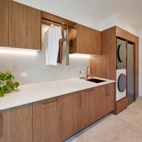 With a warm and inviting colour palette that mirrors their kitchens style, Kristian and Mimi have created a stylish and practical laundry with our new Tuscan Woodmatt doors, combining flat cabinetry with Sorrento doors which have a grooved profile. Abundant storage solutions, including a laundry hamper, hanging rail, and linen/broom cupboard, keep everything organised.