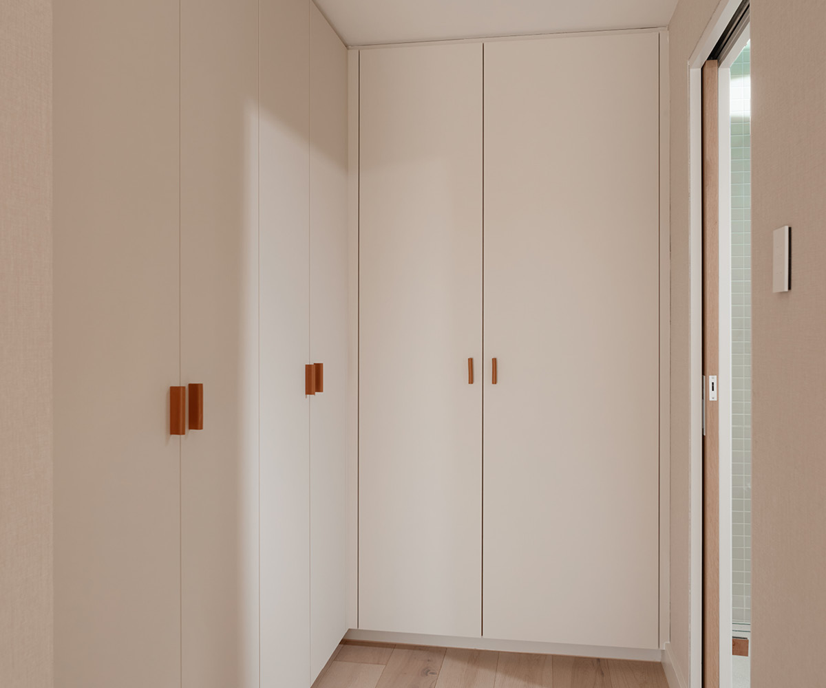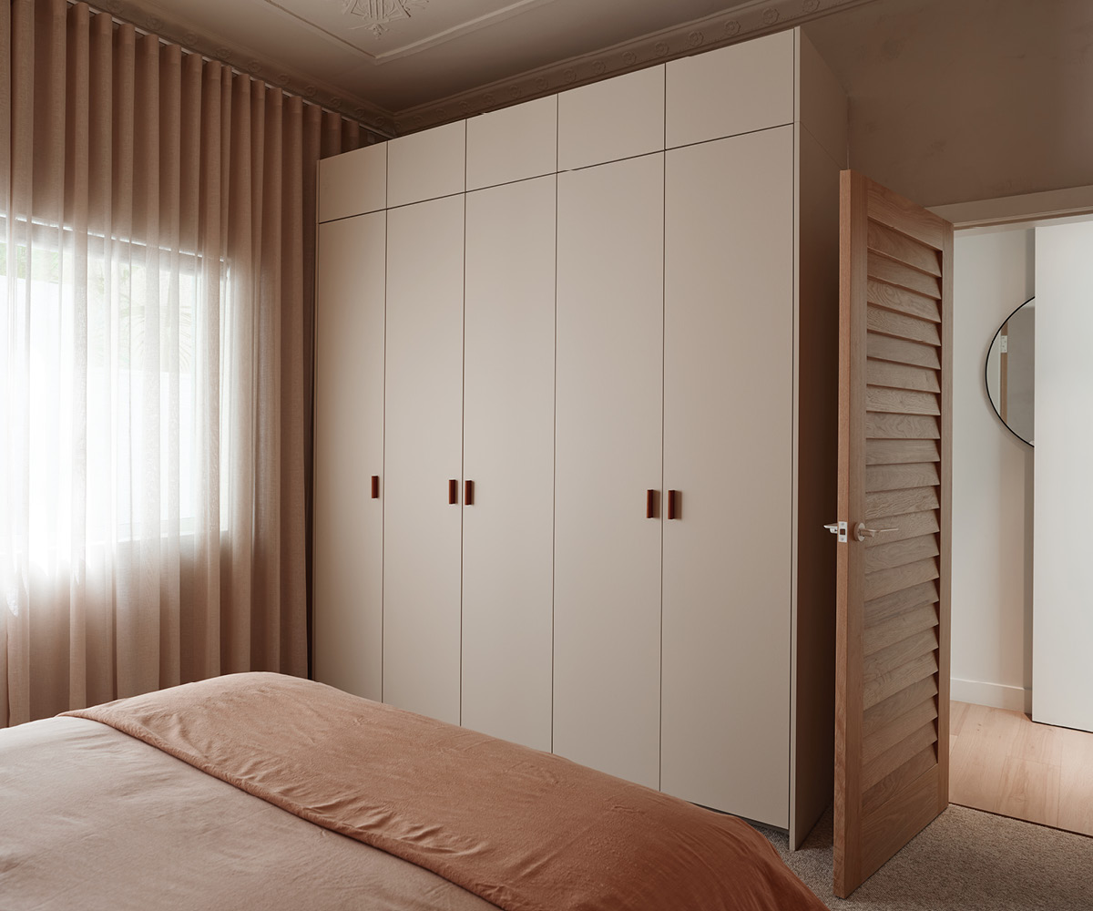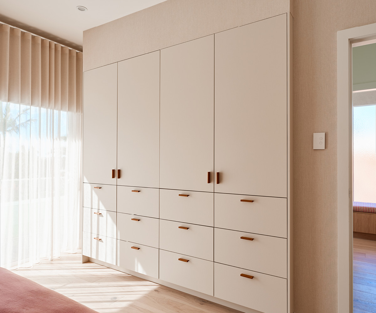 In addition to the kitchen and laundry, the home also features a home office and a series of wardrobes. The master suite features not one but two wardrobes, offering a wealth of much-needed storage. Our sophisticated Grigio Pelle beige wardrobe doors feature a leather like finish and have been teamed with our new Mini Leather Pull handles in Tan. The built in wardrobe in the main part of the bedroom offers open shelving and soft-close drawers, while the walk-through wardrobe which connects the master bedroom to the ensuite exclusively features hanging space.