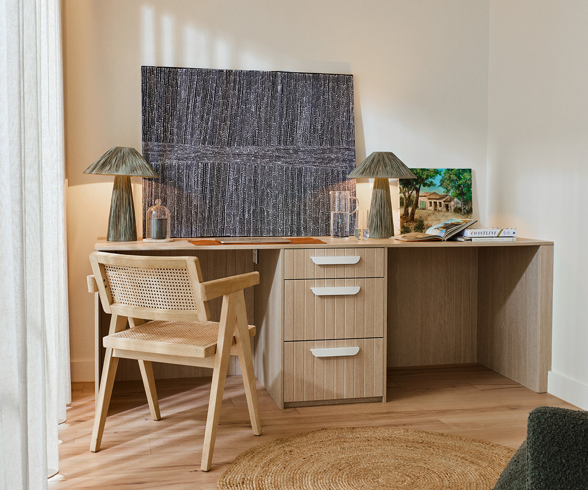 The light-filled guest bedroom wardrobe features a beautiful seating bench with concealed storage underneath, while the home office is simple yet effective, offering space for two people to work or study with added storage thanks to soft close drawers.