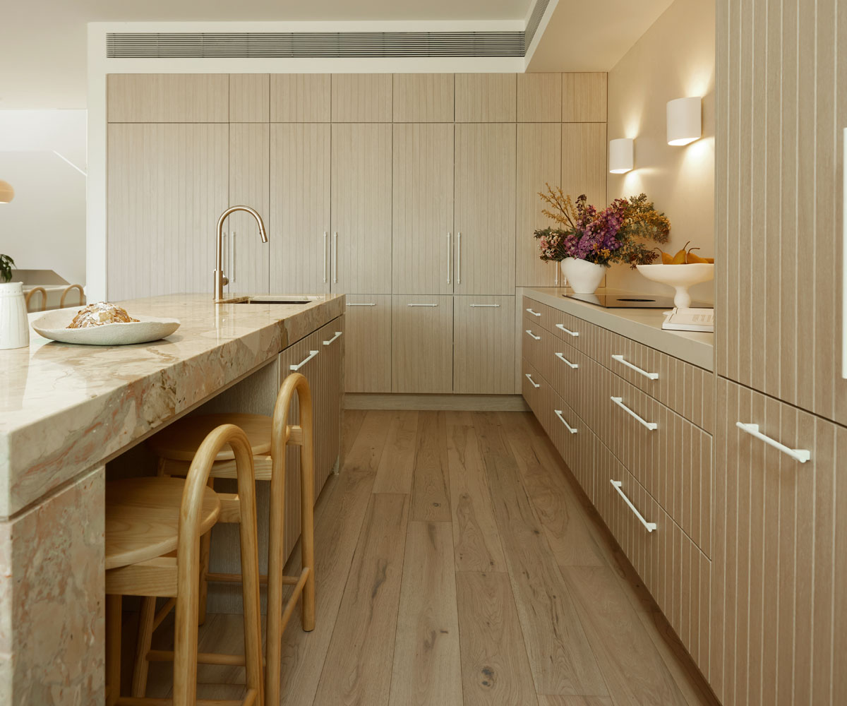 Due to its beachy location, the colour palette brief was a contemporary coastal aesthetic. Kinsman’s Coastal Oak Woodmatt doors were the perfect pick, particularly as Darren selected our Avalon design which features beautiful V-groove detailing. We then paired the timber-look cabinetry with crisp white handles to bring the look together.