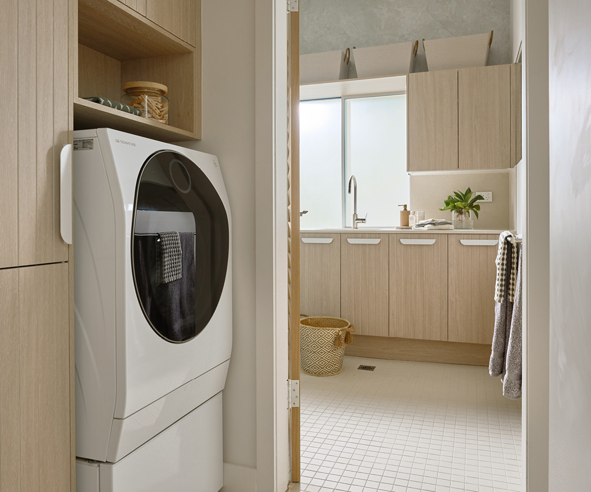 Rather than creating a standalone laundry, the laundry room has been combined with a powder room. This multifunctional space ticks all the boxes – from plenty of bench space for folding clothing, room for high-end laundry appliances and plenty of storage. It’s a clever use of space that maximises the floorplan Darren had available.