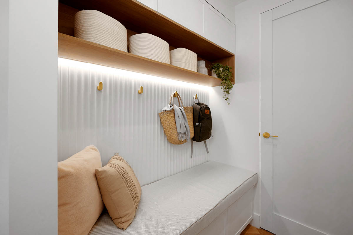 Exuding a sophisticated Coastal vibe, Ronnie and Georgia’s Mud Room offers a plethora of extra storage courtesy of drawers, wall cupboards and open shelving. White and timber tones feature once again, perfect for the home’s serene and natural colour scheme. A bench seat in Alpine White Quadra 38mm Laminate from the Kinsman Kitchen’s range is a wonderful choice due to its low maintenance and easy-to-clean character, perfect for this high-traffic zone. Cool LED Strip lighting illuminates the space, adding to the style and functionality of the design, and the open shelf provides space for styling decor.