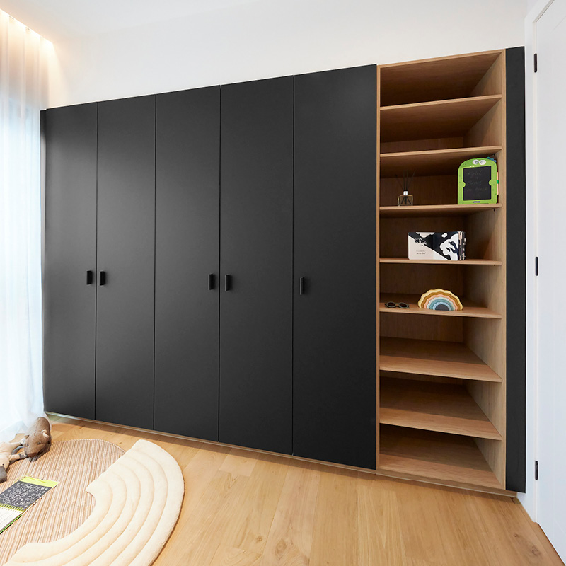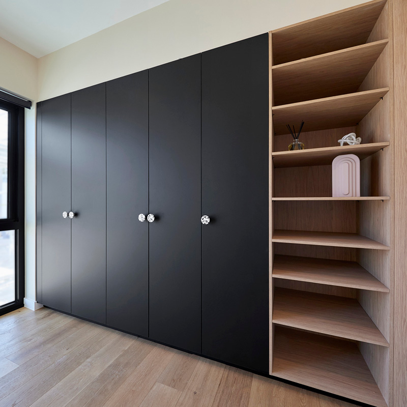 Kylie and Brad have paired Volcanic Black wardrobe doors with timber-inspired Oak Woodgrain interiors, ensuring that their built-in wardrobe is a statement within their second bedroom. Our new Touch Milano Black Leather Pull handles add to the luxe look, while the inclusion of hanging space, soft-close Matrix Drawers and open shelving maximises wardrobe storage.