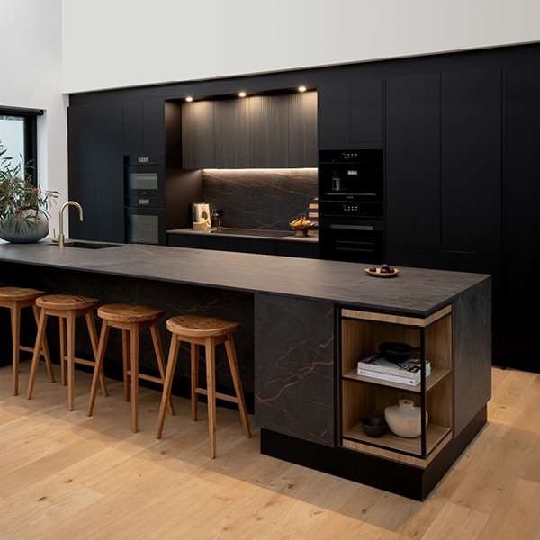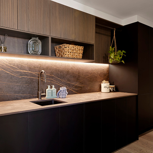 Kylie and Brad’s laundry exudes a bold, dark elegance with Black Ultramatt cabinetry and rich timber accents in Bottega Oak Woodmatt. The dramatic Dekton Laurent surfaces, with gold crisscrossed veins, enhance the sleek, seamless look.