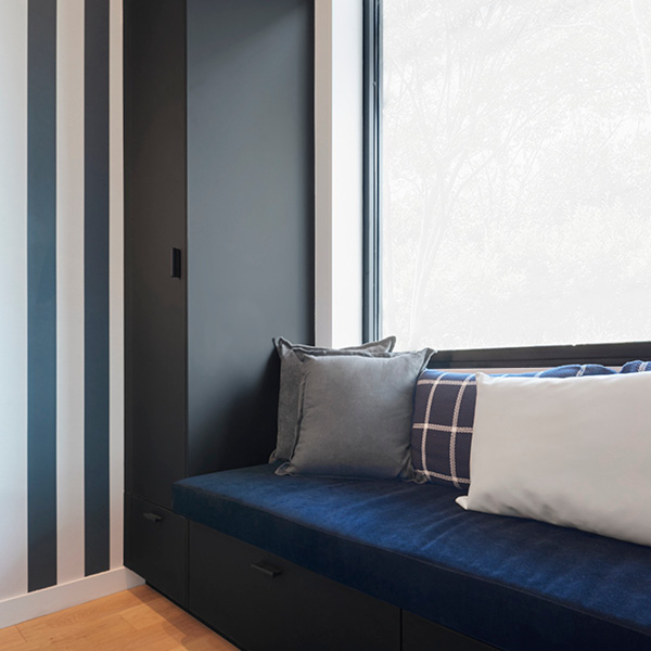 Maximising a compact space, Kylie and Brad designed a wardrobe that also serves as a seating and reading nook. Framed around a window, the sleek Volcanic Black cabinetry with Milano Black Leather Pull handles features low drawers, a slim cupboard with hanging space, Oak Woodgrain interiors, LED bar lights with sensors, and a Wardrobe Lift.