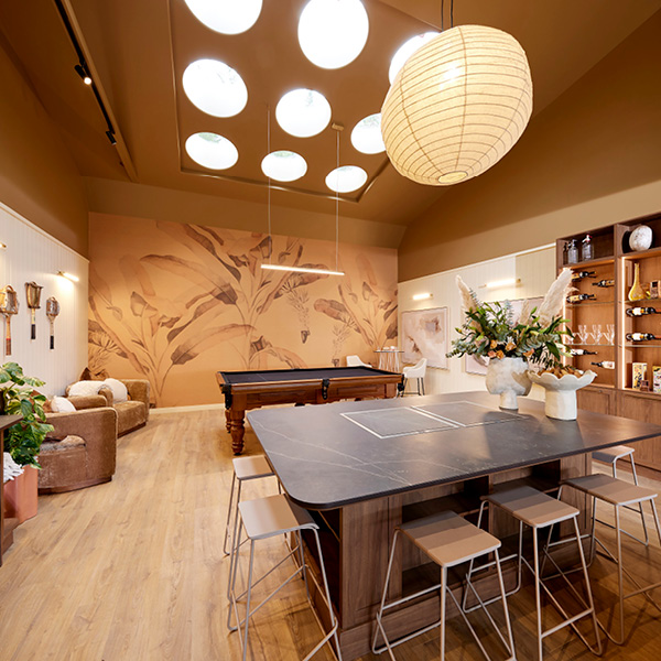 This fun-filled Games Room for the Clubhouse features our Sepia Tuscan Walnut cabinetry and Champagne Bronze Vesio D handles. Clear glass shelving and Dekton Somnia surfaces add to the inviting atmosphere. At the heart of the space is a large island bench equipped with Hafele’s innovative Ninka Qanto-B shelving system, which reveals hidden storage at the touch of a button, bringing a touch of luxury.